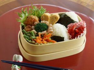 As mães se dedicam a preparar refeições completas, ricas em nutrientes, com capricho e equilíbrio. Além disso, enviam com os filhos o tradicional Obentō, uma marmita colorida, bem distribuída e cuidadosamente montada — como a da foto abaixo: